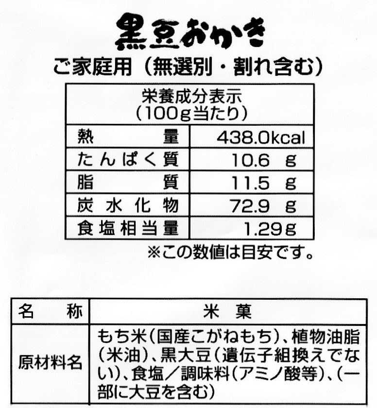 「黒豆おかき」の家庭用パッケージ。割れや形の悪い物も含みますが、味は変わらずお得な価格でご購入頂けます。袋の中は個包装ではありません。