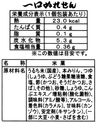 焼き立ての一口サイズのうすやきせんべいを、秘伝の醤油たれにつけ込んだしっとりとしたぬれせんです。お餅のようなもちもちとした食感、香ばしい醤油の香りをお楽しみください。