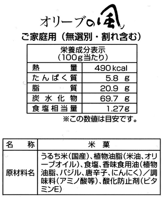 「オリーブの風」のご家庭用パッケージ。割れや形の悪い物も含みますが、味は変わらずお得な価格でご購入頂けます。袋の中は個包装ではありません。