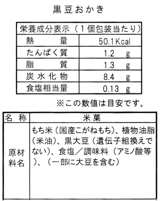 「黒豆おかき」の個包装。ご家庭で、ちょっとしたお使い物としてご利用いただけます。