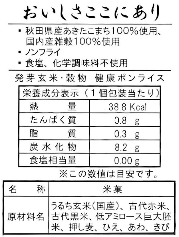 秋田県大潟村産あきたこまちの発芽玄米を100%使用し、そのままおせんべいにしました。良質な発芽玄米の風味が、独特な歯ざわりとともにお楽しみいただけます。素材へのこだわりが健康へのこだわりにいきつきました。
