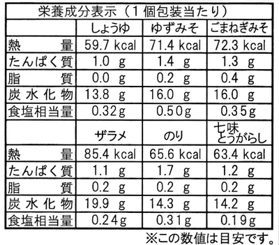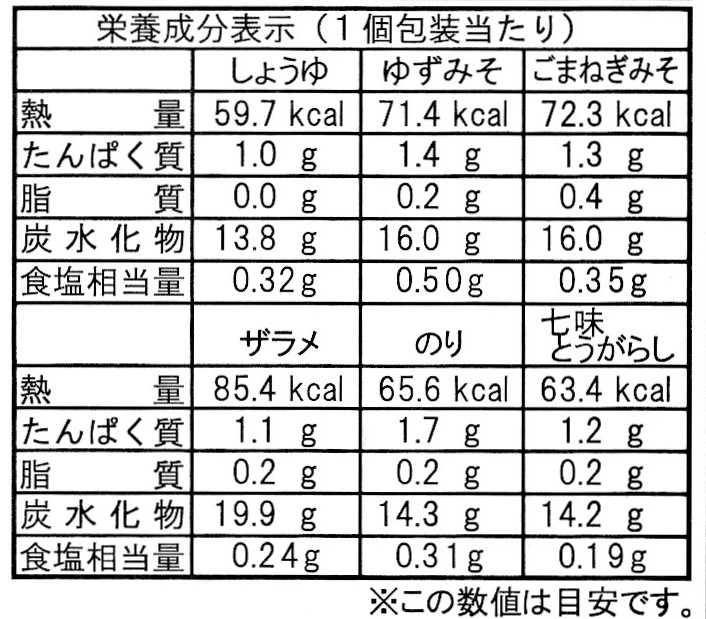 ごま葱みそ・七味とうがらし・ザラメ(梅肉入り)・のり各1枚